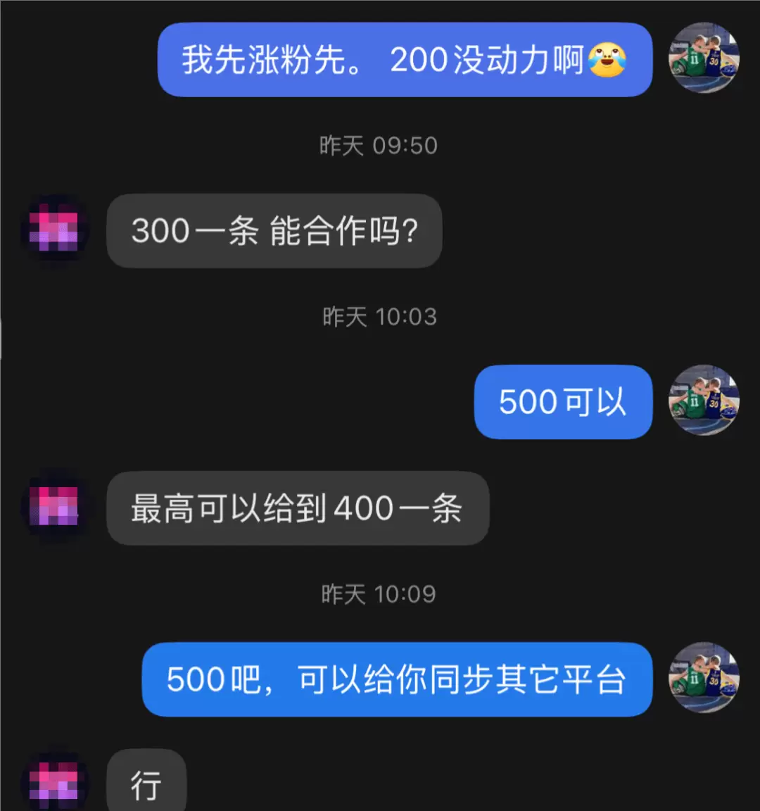 昨天算是真正接到了第一条广告,价格是五百块,中间也是来回拉扯了一番,从最初的两百谈到了五百。