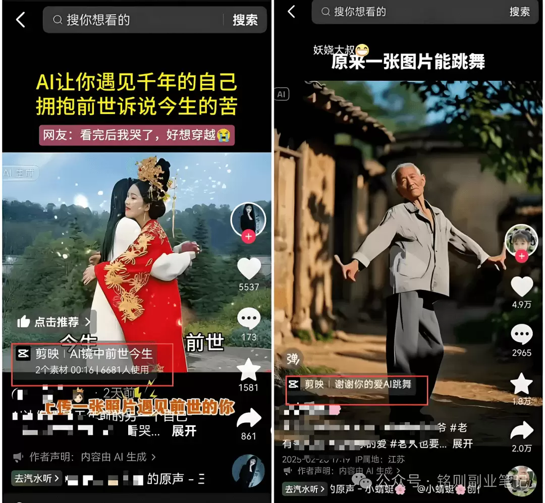 然后就是内容制作环节,内容也不用复杂,官方推荐的是用剪映里的“剪同款模板”来做短视频,这些模板很多都比较火,像什么自拍、旅游、穿搭的风格都有,你可以在小红书或百度搜一些高质量图片素材,剪映导入进去,改改时长,加个滤镜,简单剪辑一下,导出发抖音就行。
