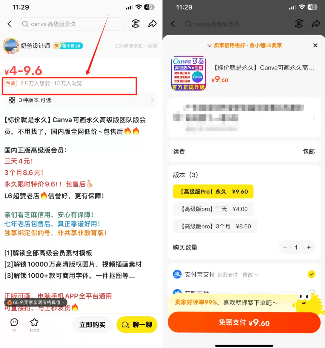 还有就是今天要说的Canva(国内叫“可画”)的会员,原价一年168元,但他们在闲鱼上只卖几块钱,想要数还特别高。