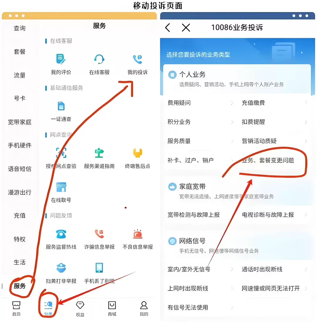 移动的:打开“中国移动”APP → 我的 → 服务中心 → 我要投诉