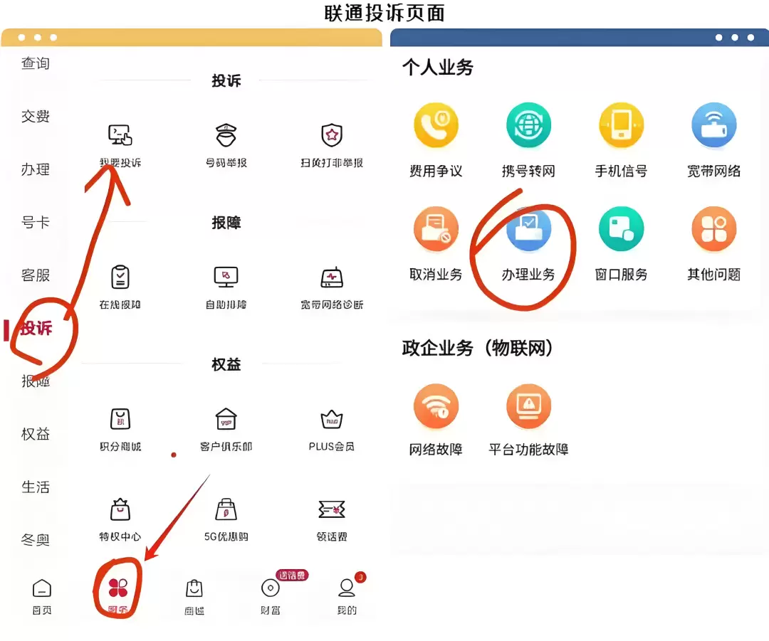 联通的:“中国联通”APP → 服务 → 投诉与建议