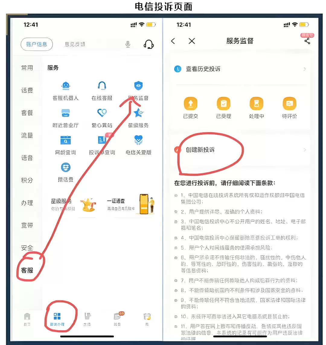 电信的:“中国电信”APP → 我的 → 服务监督 → 我要投诉