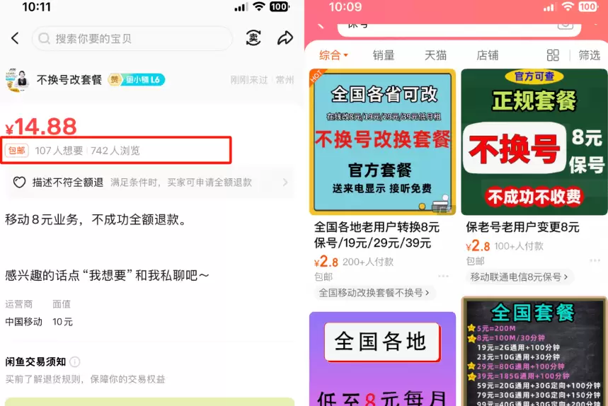 打开闲鱼淘宝去搜,关键词“改套餐”,结果跳出来一堆卖家,一单5到10块不等,销量几百几千,单价虽不高,但是累计起来也是不少的钱。