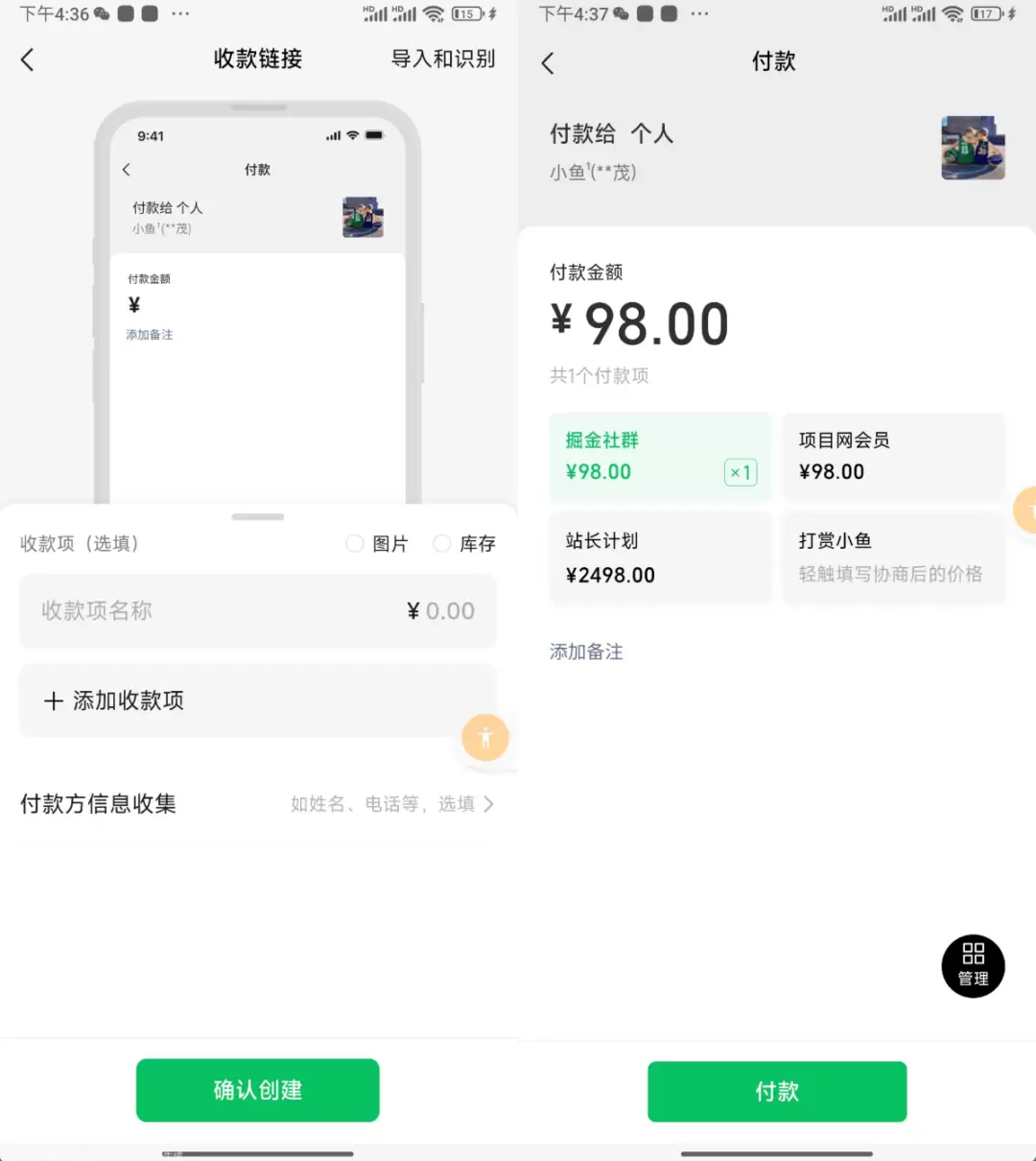 具体的操作也很简单,先去微信搜“微信收款助手”,关注一下,然后点进去选择“个人收款”,接着进去收款设置,添加收款项,把你的服务和对应的价格提前设置好,等客户点击你生成的那个蓝链,就会跳出你设置好的商品项,价格、数量,不用再反复沟通。